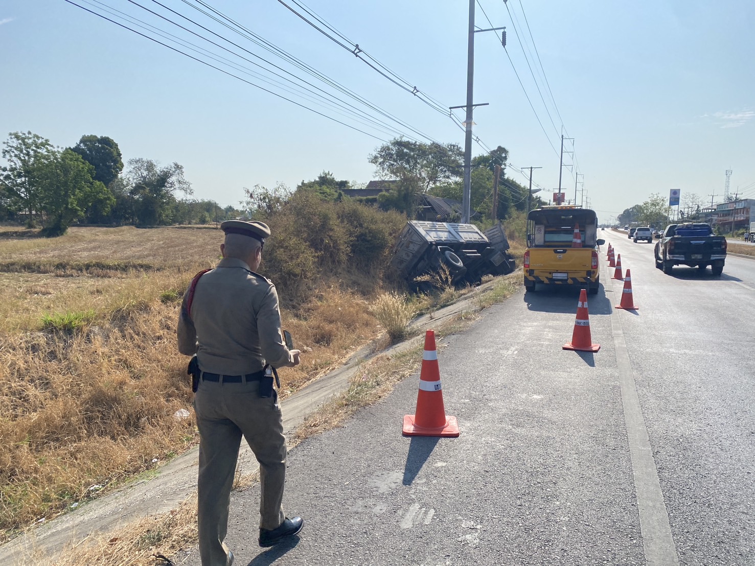 ตรวจสอบเหตุ รถพ่วงเสียหลักลงข้างทาง