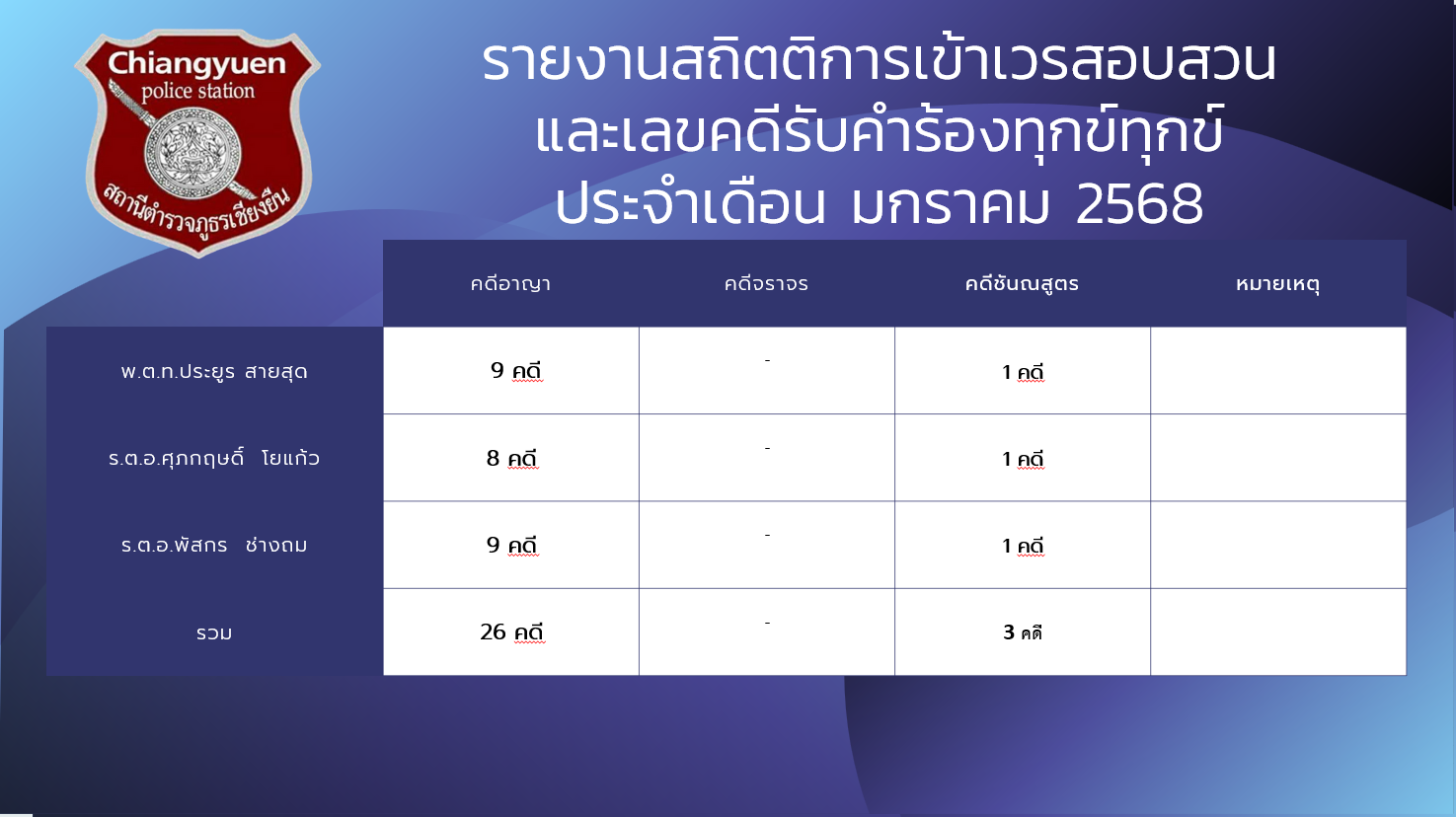 เรียน ผู้บังคับบัญชาวันนี้ ( 27 มกราคม 2568)โดยการอำนวยการของพ.ต.อ.เจษฎา คุ้มศาสตรา ผกก.สภ.เชียงยืน,…