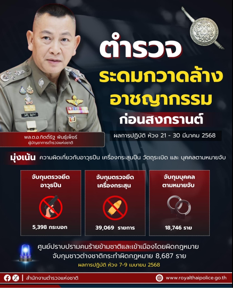 พล.ต.อ.กิตติ์รัฐ พันธุ์เพ็ชร์ ผู้บัญชาการตำรวจแห่งชาติ สั่งการตำรวจทั่วประเทศระดมกวาดล้างอาชญากรรมอย…