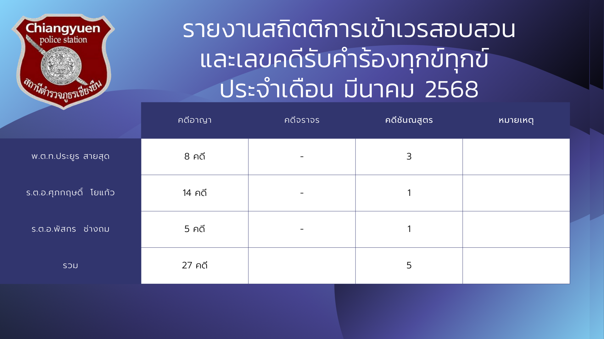 วันที่ 31 มีนาคม 2568 เวลา 23.59 น. ด.ต.ธนบดี โหสี รายงานสถิติการเข้าเวรสอบสวนและเลขคดีที่รับคำร้องท…