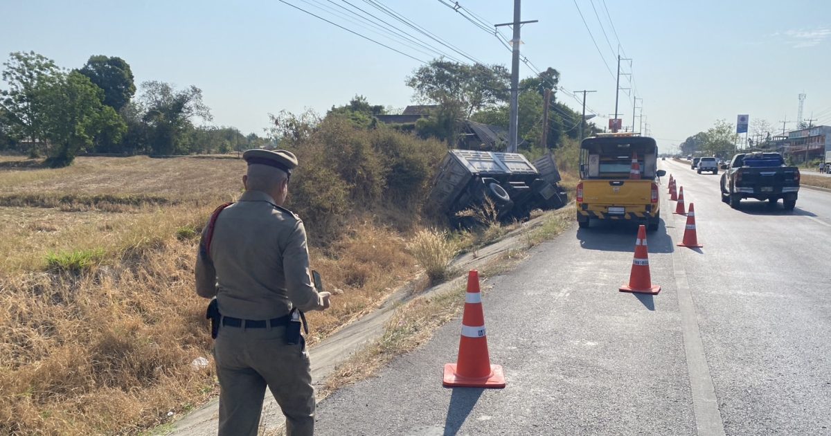 ตรวจสอบเหตุ รถพ่วงเสียหลักลงข้างทาง