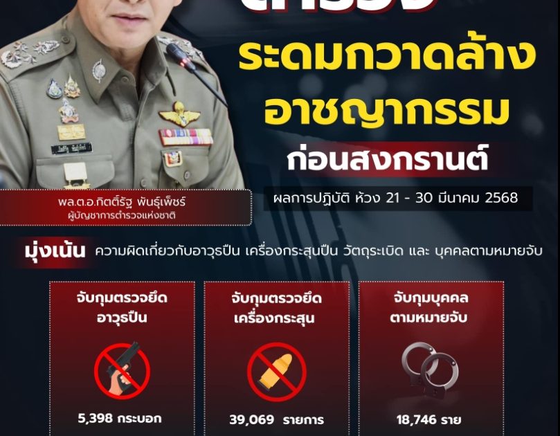 พล.ต.อ.กิตติ์รัฐ พันธุ์เพ็ชร์ ผู้บัญชาการตำรวจแห่งชาติ สั่งการตำรวจทั่วประเทศระดมกวาดล้างอาชญากรรมอย่างต่อเนื่อง โดยเฉพาะช่วงก่อนเทศกาลสงกรานต์ เพื่อความปลอดภัยและความสงบสุขของพี่น้องประชาชน