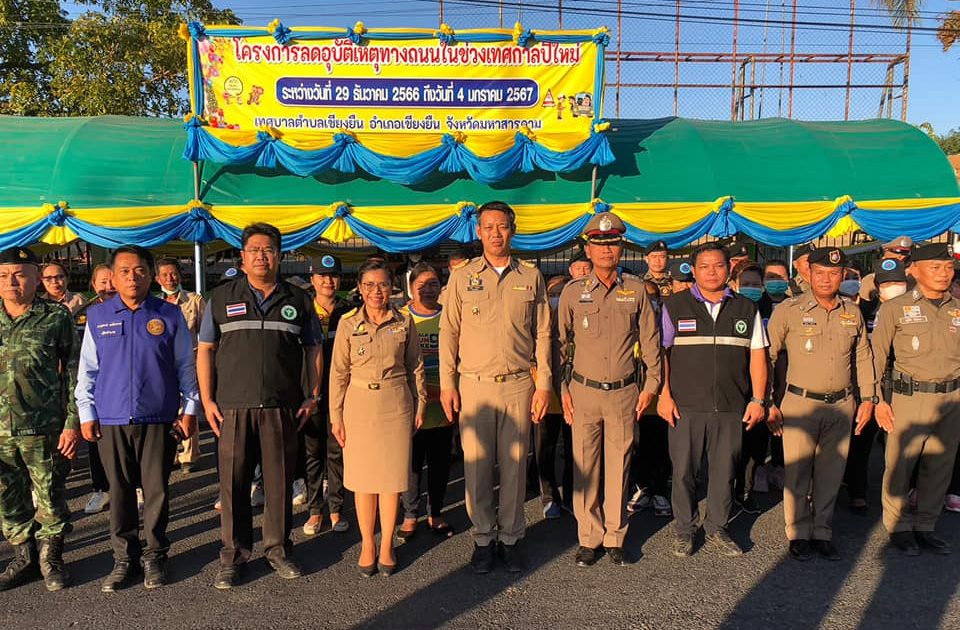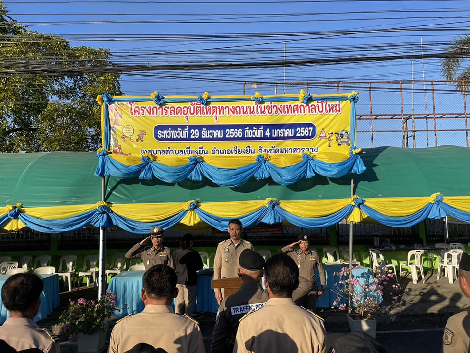 พ.ต.ท.ณพรุจ ราชคาม รองผกก.ป.ฯ, พ.ต.ท.ภูดิส ชัยชนะ สวป.ฯ, ร.ต.อ.ทวีศักดิ์ พรหมคำน้อย รอง สวป.ฯ/ร้อยเวร 60, ร.ต.ต.จักรพรรณ พาที รอง สว.(สส.)ฯ/ร้อยเวร 20 พร้อมด้วยสายตรวจรถยนต์/จยย.ชุดวิหคและสายตรวจชุดจราจร “ร่วมกับฝ่ายปกครอง, สาธารณสุขอำเภอเชียงยืน, โรงพยาบาลเชียงยืน และเทศบาลตำบลเชียงยืน” โดยการอำนวยการของ นายสมพร ควรคำคง นายอำเภอเชียงยืน เป็นประธานในพิธีเปิด จุดบริการประชาชน บริเวณหน้าโรงเรียนบ้านเชียงยืน ถนนสายขอนแก่น-เชียงยืน-ยางตลาด ต.เชียงยืน อ.เชียงยืน จ.มหาสารคาม ตามโครงการลดอุบัติเหตุทางถนนในช่วงเทศกาลปีใหม่ 2567 ระหว่างวันที่ 29 ธ.ค.2566 ถึง 4 ม.ค.2567