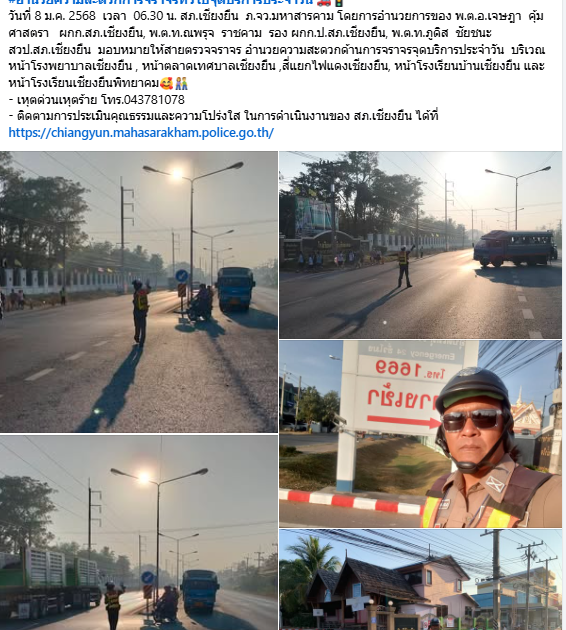 สภ.เชียงยืน ภ.จว.มหาสารคาม โดยการอำนวยการของ พ.ต.อ.เจษฎา คุ้มศาสตรา ผกก.สภ.เชียงยืน, พ.ต.ท.ณพรุจ ราชคาม รอง ผกก.ป.สภ.เชียงยืน , พ.ต.ท.ภูดิส ชัยชนะ สวป.สภ.เชียงยืน มอบหมายให้เจ้าหน้าที่ตำรวจชุดจราจร ตั้งจุดตรวจกวดขันวินัยจราจรเพื่อเป็นการป้องกันและลดอุบัติเหตุทางถนน บริเวณหน้าโรงเรียนบ้านเชียงยืน ถนนขอนแก่น-เชียงยืน ![]()