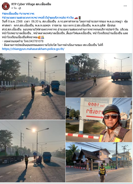 วันที่ 8 ม.ค. 2568 เวลา 06.30 น. สภ.เชียงยืน ภ.จว.มหาสารคาม โดยการอำนวยการของ พ.ต.อ.เจษฎา คุ้มศาสตรา ผกก.สภ.เชียงยืน, พ.ต.ท.ณพรุจ ราชคาม รอง ผกก.ป.สภ.เชียงยืน, พ.ต.ท.ภูดิส ชัยชนะ สวป.สภ.เชียงยืน มอบหมายให้สายตรวจจราจร อำนวยความสะดวกด้านการจราจรจุดบริการประจำวัน บริเวณหน้าโรงพยาบาลเชียงยืน , หน้าตลาดเทศบาลเชียงยืน ,สี่แยกไฟแดงเชียงยืน, หน้าโรงเรียนบ้านเชียงยืน และหน้าโรงเรียนเชียงยืนพิทยาคม![]()