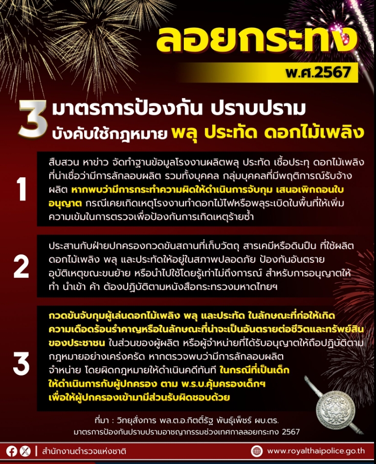 สำนักงานตำรวจแห่งชาติ ออก 3 มาตรการป้องกัน ปราบปราม บังคับใช้กฎหมาย เกี่ยวกับ “พลุ ประทัด ดอกไม้ไฟ” เพื่อความปลอดภัยในชีวิตและทรัพย์สินของประชาชน