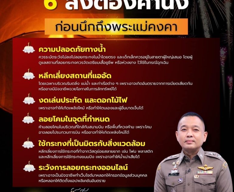 ดังนั้น เพื่อให้เทศกาลลอยกระทงเป็นไปอย่างปลอดภัย สนุกสนาน และไม่ทำลายสิ่งแวดล้อม สำนักงานตำรวจแห่งชาติจึงขอแนะนำ 6 สิ่งที่ต้องคำนึง ในช่วงเทศกาลลอยกระทง ดังนี้