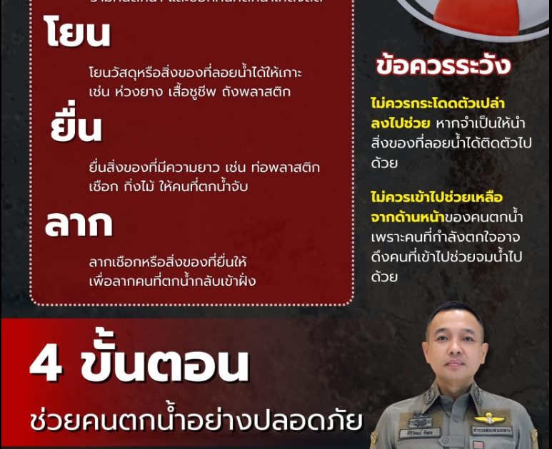 สำนักงานตำรวจแห่งชาติ แนะนำ “ตะโกน โยน ยื่น ลาก” 4 ขั้นตอนช่วยคนตกน้ำอย่างปลอดภัย